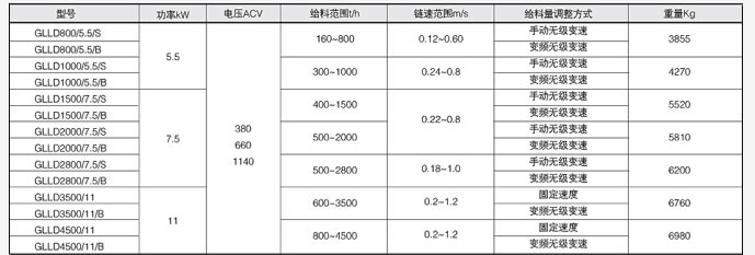 示例:客定給料能力為1000t/h,裝載功率為5.5KW的手動調(diào)速鏈帶式給料機型號表示為GLLD1000/5.5/S
